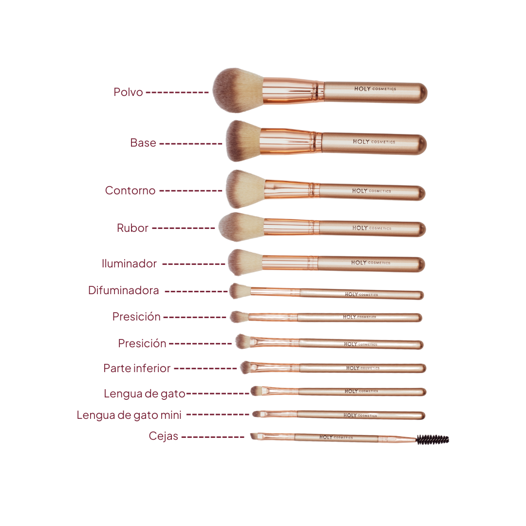 - 12 brochas premium: incluye brochas para base, rubor, contorno, iluminador, sombras y difuminado
